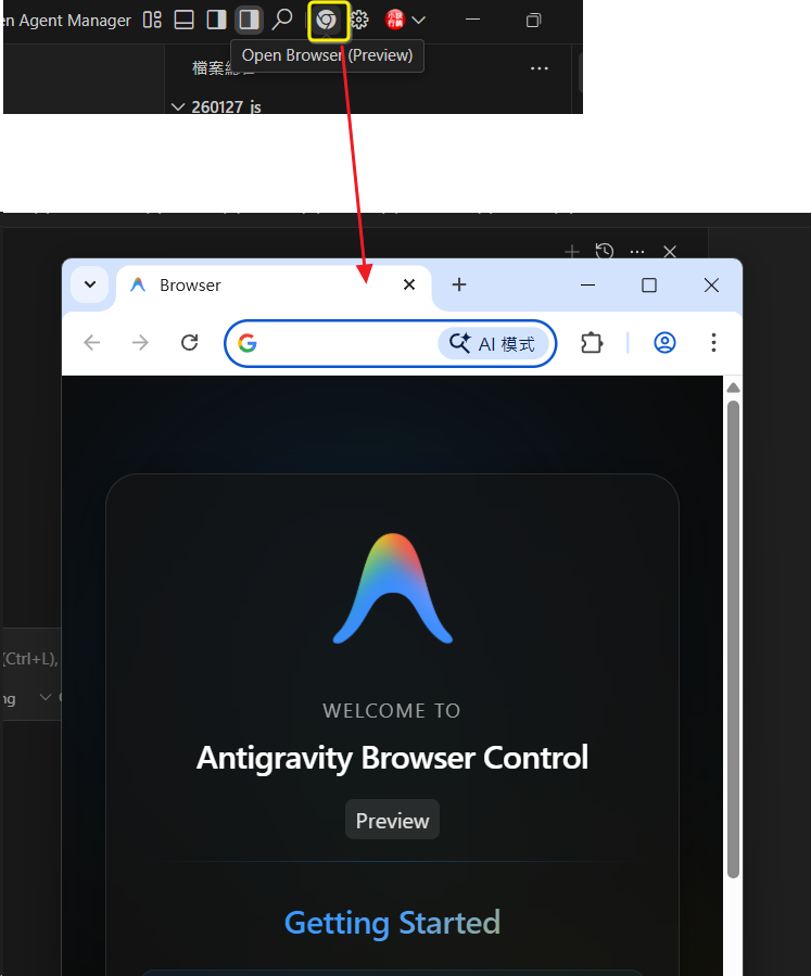 如下圖,已經正常可以開啟 Antigravity 的瀏覽器囉!